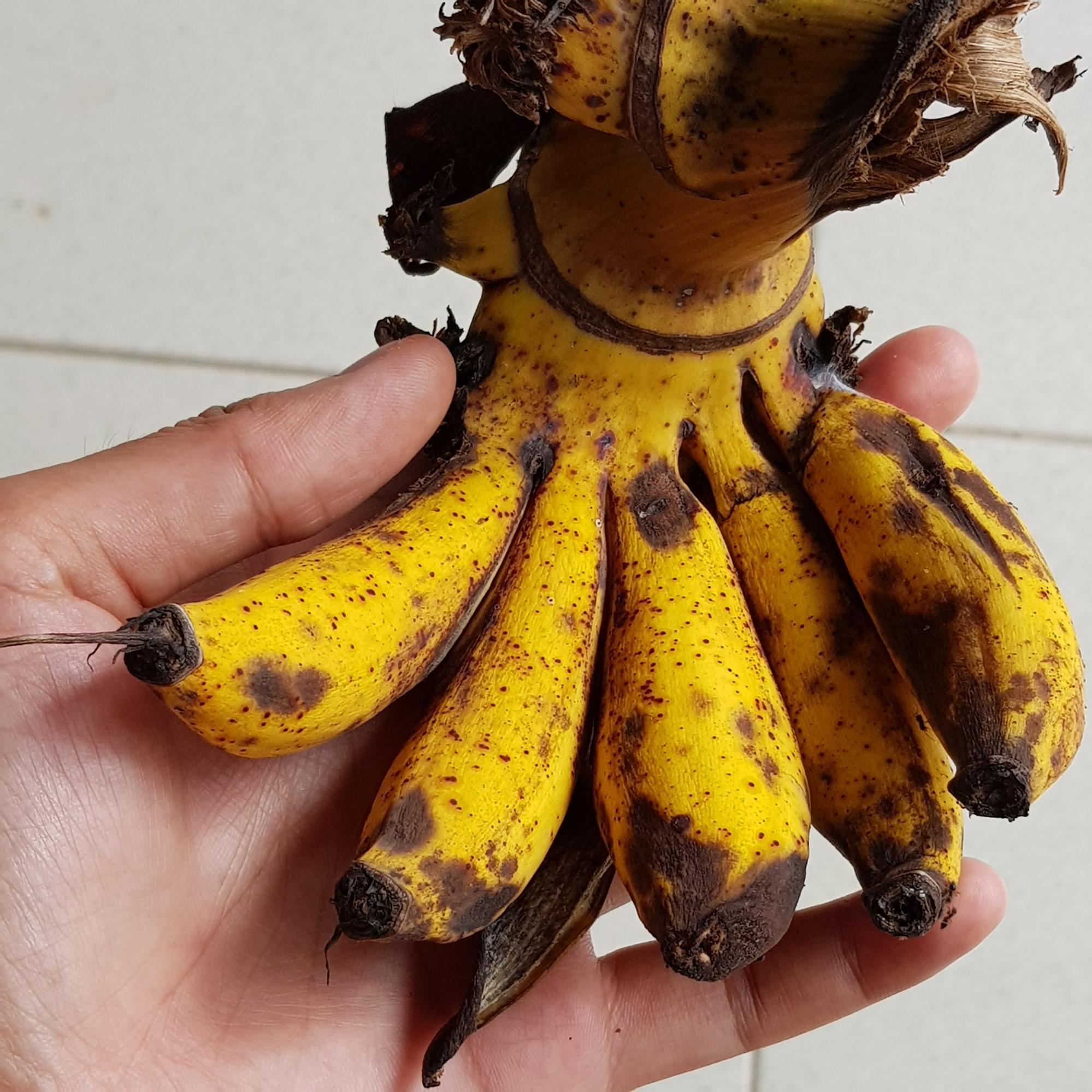 Yuuki’s parents have six types of bananas growing in their garden in Indonesia: Pisang Batu (M. balbisiana), Pisang Morosebo (Dwarf Cavendish), Pisang Raja Sere (M. paradisiaca), Pisang Nangka (M. paradisiaca), Pisang Susu (M. acuminata non-Cavendish), and the cooking, plantain variety Pisang Tanduk.