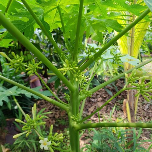Papaya trees, apparently, are divided into male trees, female trees and also hermaphroditic trees so they can self pollinate. Nevertheless, we can harvest the leaves and the young papaya for cooking. We use the julienned young papaya and sauté or add coconut milk for curry-like food or wait until they ripen for the papaya fruit that you see in the market.