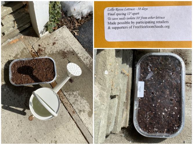 It was warm enough to attempt winter sowing. I chose ‘Lollo Rossa’ lettuce as my first test. I found a container with a lid in the garbage and washed it. I then poked holes using scissors for the container, knife for the plastic lid to create holes for drainage and humidity.