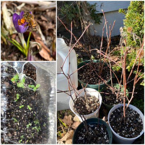 The first warm day came today for the next few days. It is temporary, though. Today, I discovered three crocuses, which made me super excited for spring and more flowers. We (mom and I) raked much of the front yard, but it was windy, so we couldn’t finish it. Flower bed in the front is now clear of dead leaves. Argued with mom regarding removing ugly hedges and invasive useless shrubs in front. I WILL get those red dogwoods in and kill the ugly stuff slowly. Seeds, cuttings are doing well.