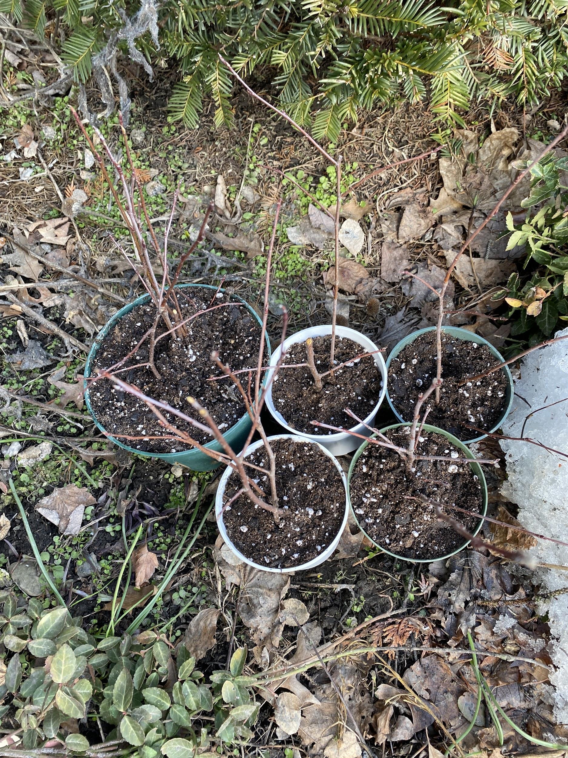 More winter sowing happened. I put in seeds for many different flowers, chives, and thyme. I received serviceberry/Juneberry (Amlanchier canandensis) cuttings as well, so I dipped them in rooting hormone and put them in pots. Hopefully, it works. I should enlarge the holes for the plastic top of my winter sown seeds, but I will get to it soonish (and I did).